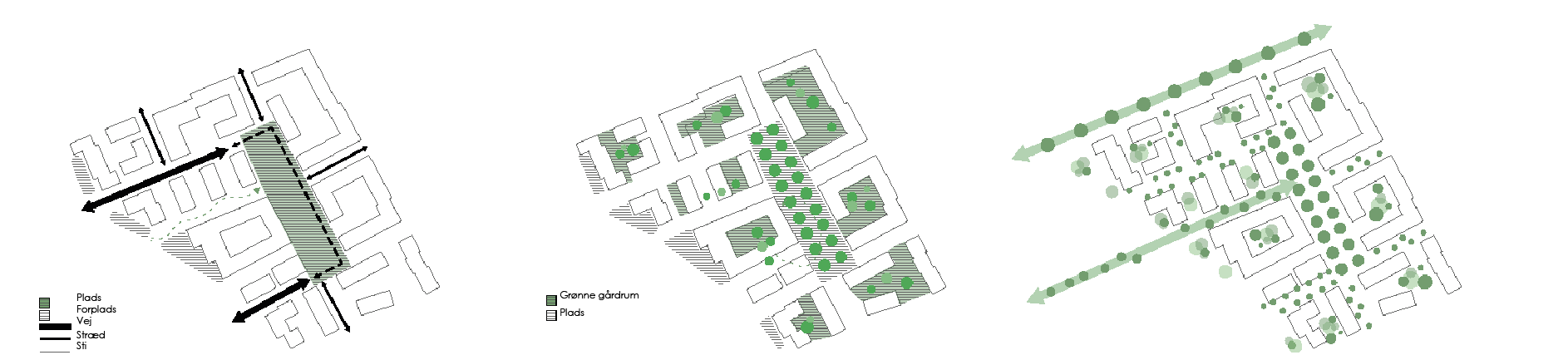 Mod de trafikerede trafikårer Amager Strandvej og Prags Boulevard rejser den fremtidige bebyggelse sig og danner en robust afskærmning ind mod området. Langs den krumme Amagerbanen, åbner bebyggelsen sig mod sydvest og lader den bløde trafik flyde.